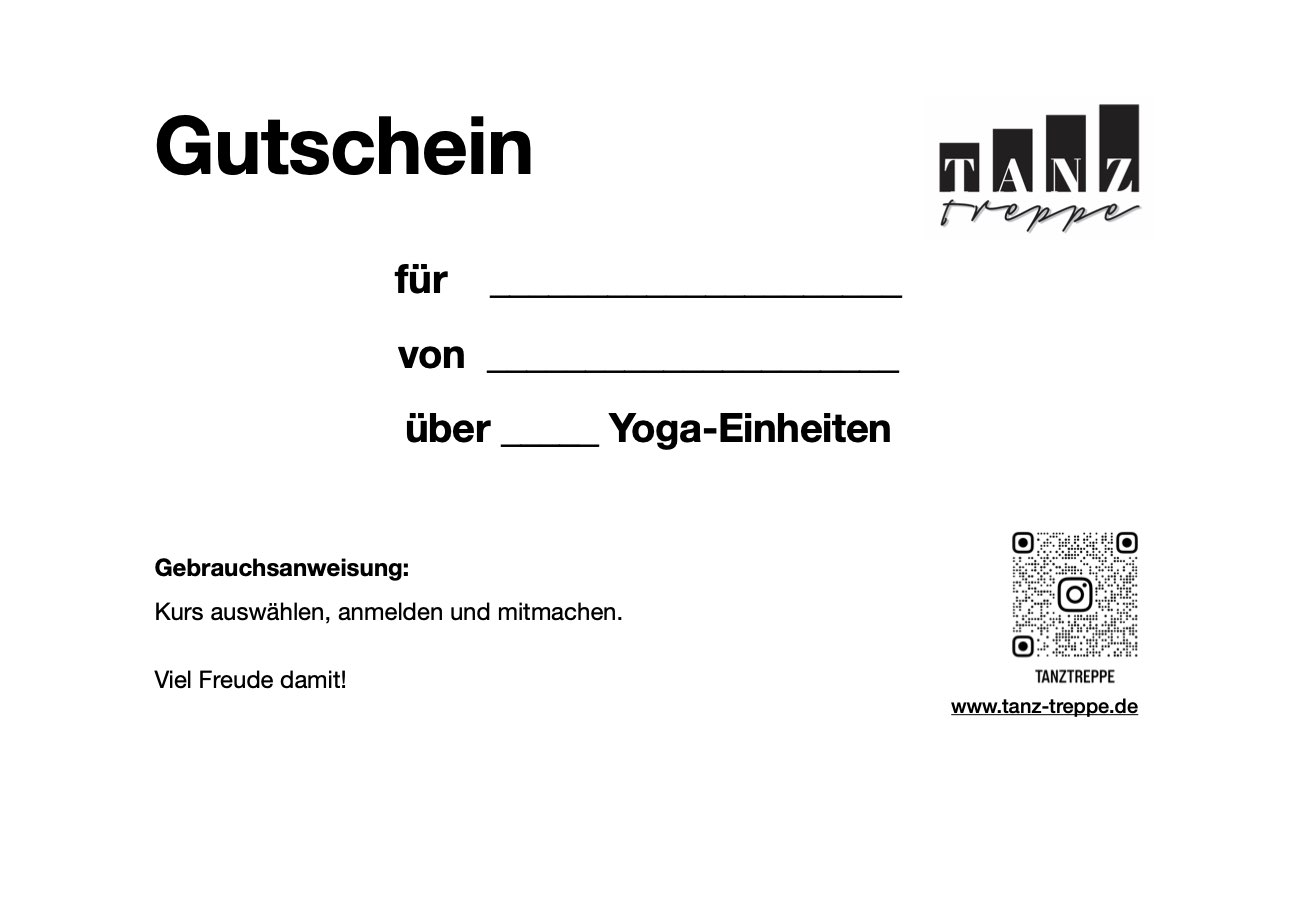 Gutscheine Verschenke eine Portion Glück: Dein Name Deine E-Mail-Adresse Wähle deinen Gutschein aus5 Yoga-Einheiten10 Yoga-EinheitenWertgutschein - Bitte die Höhe angeben Deine Nachricht (optional)